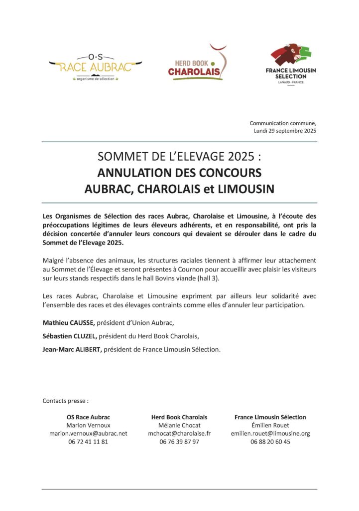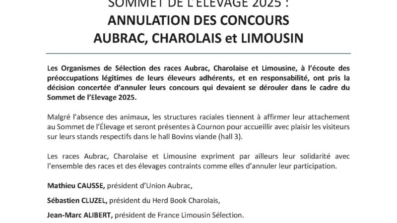 SOMMET DE L’ELEVAGE 2025 : ANNULATION DES CONCOURS AUBRAC, CHAROLAIS et LIMOUSIN